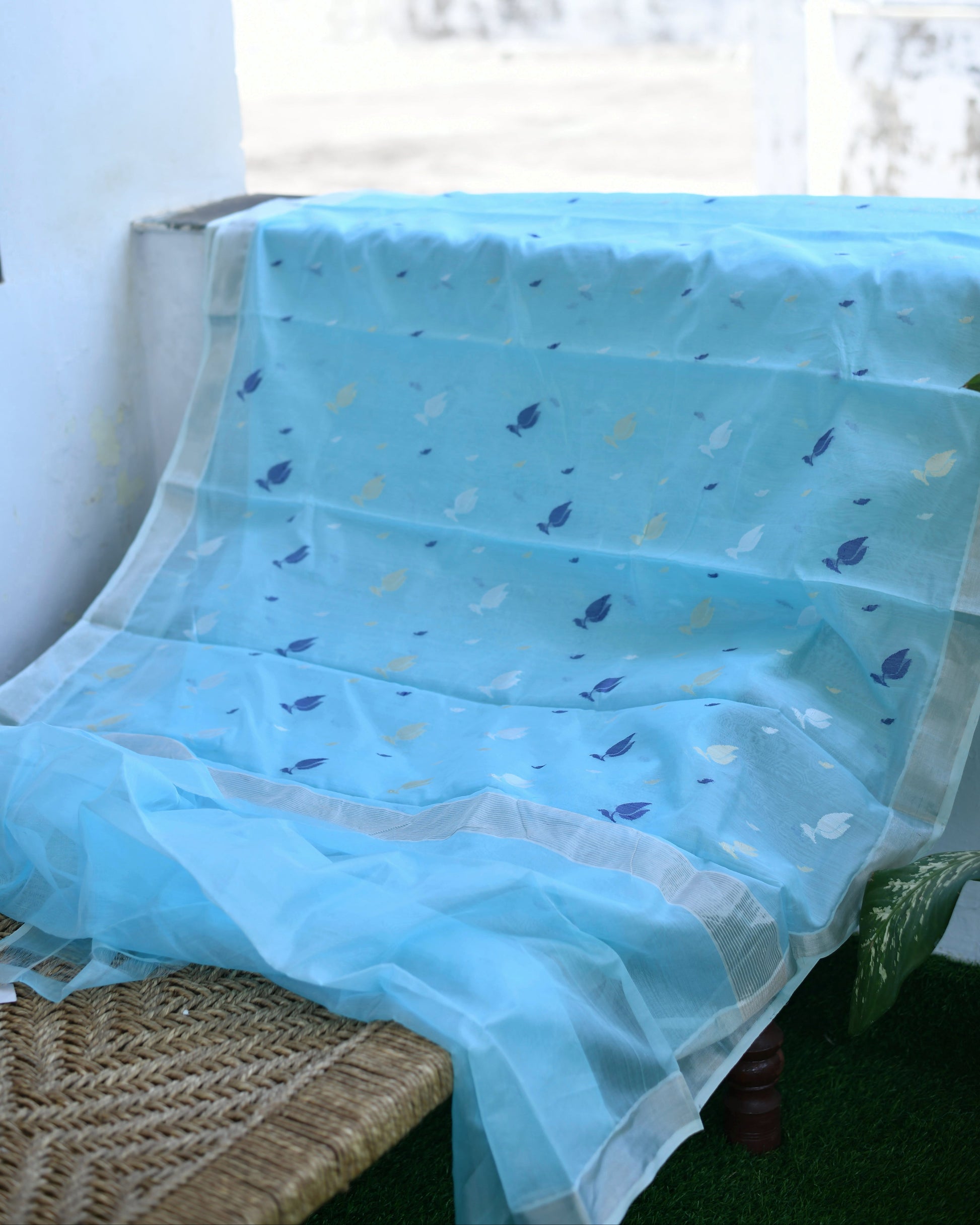 Embrace serene elegance with Chanderi Blue, a handwoven silk-cotton Chanderi saree in a beautiful blue shade. Its soft sheen and timeless charm make it perfect for both casual gatherings and formal occasions.