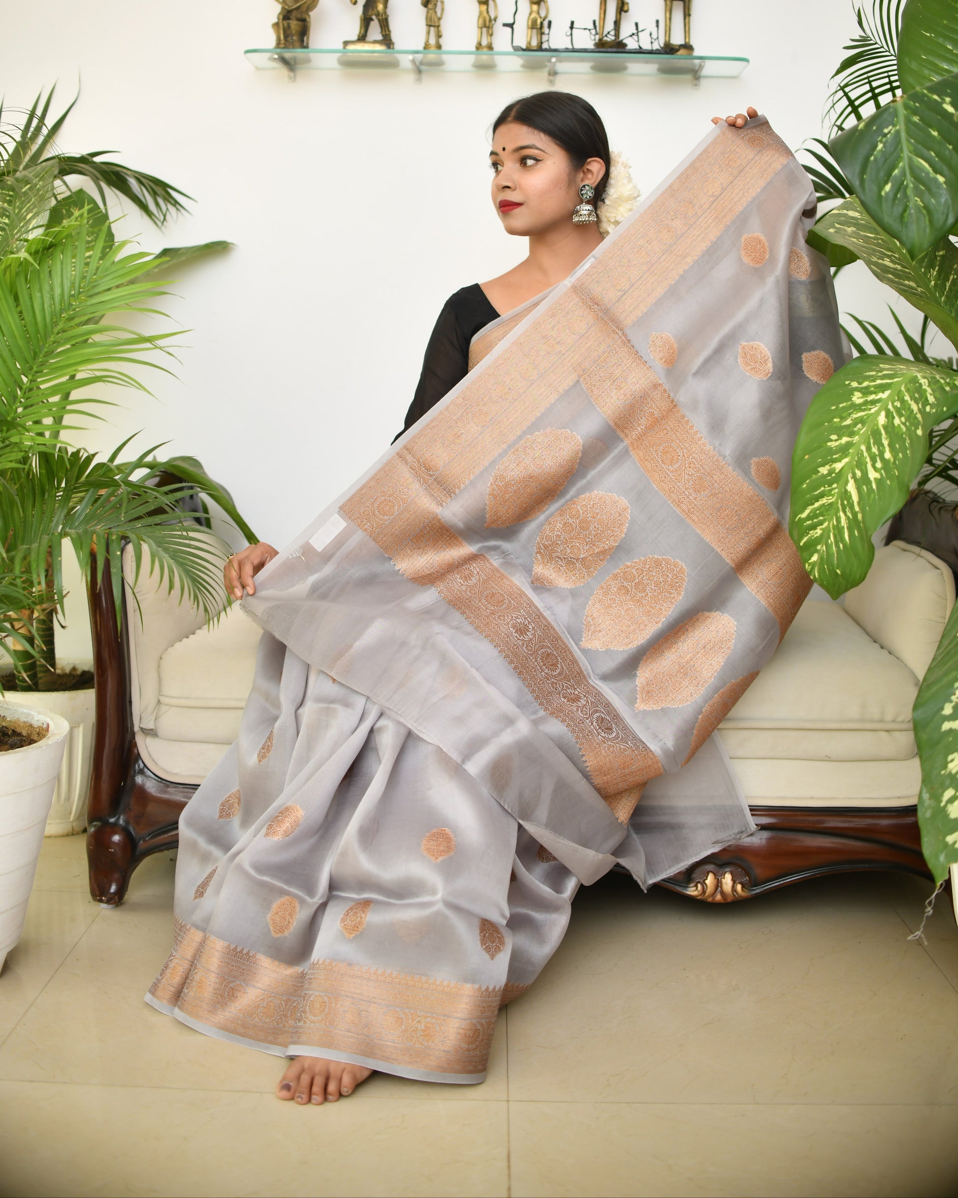 Woven from luxurious pure silk, this saree features a lustrous drape, buttery-soft texture, and a graceful fall. The glistening gold zari motifs add a regal touch, reflecting the richness of India’s royal past.