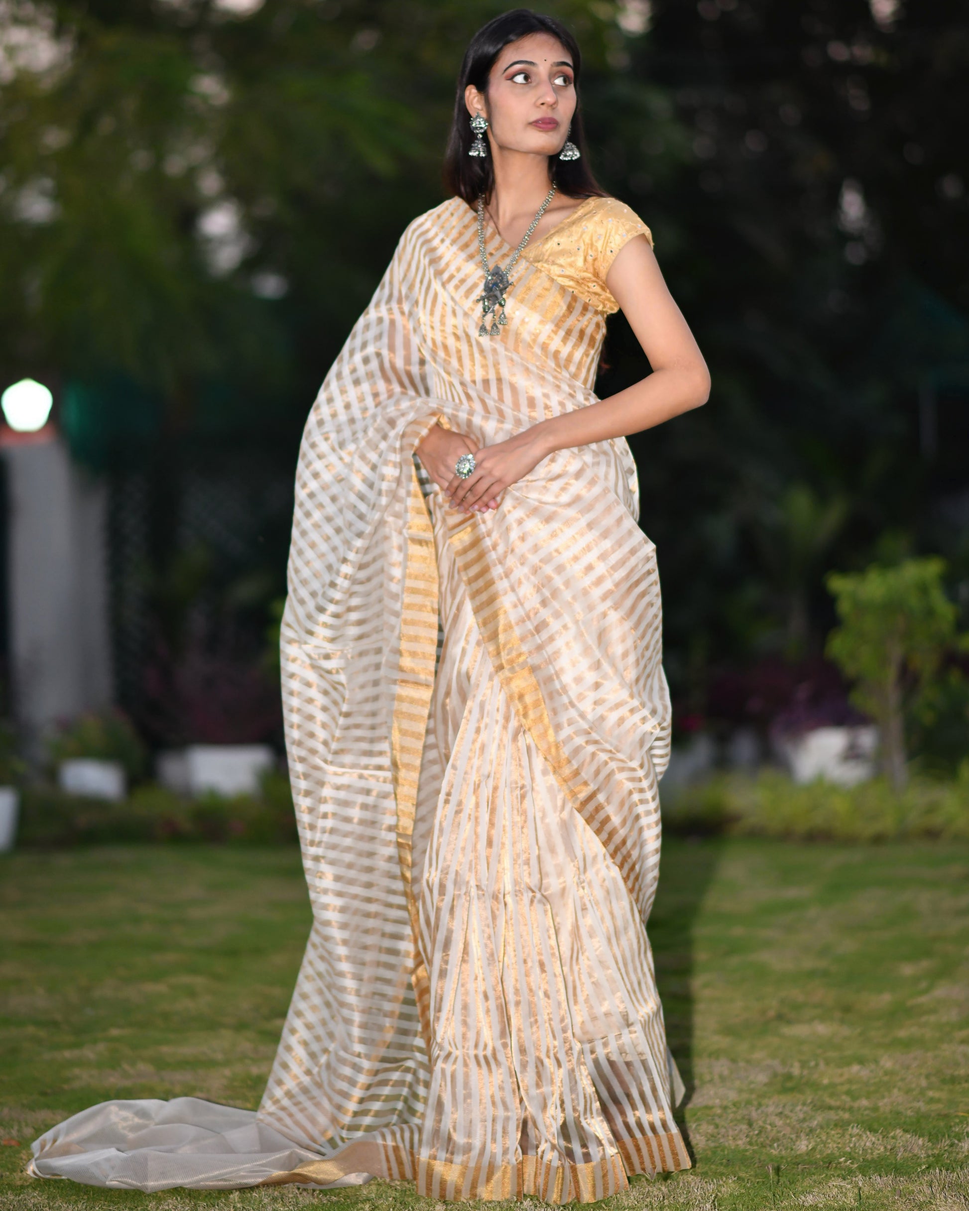 Ivory Grace – Off-White Handwoven Pure Silk Cotton Chanderi Saree with Blouse & Handloom Tag