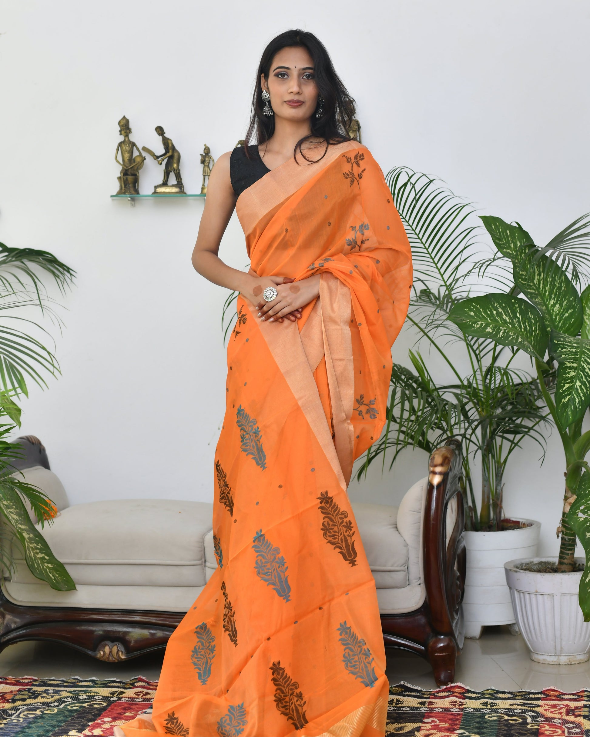 Tangerine Grace – Orange Handwoven Pure Silk Cotton Chanderi Saree with Blouse & Handloom Tag